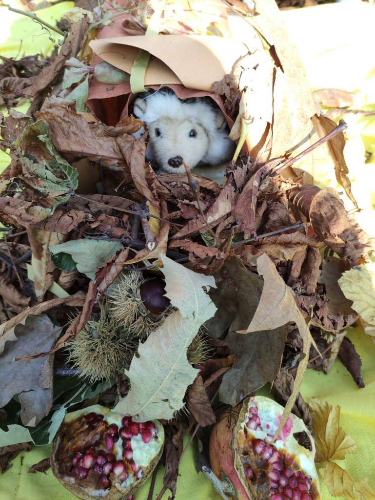 Riccio spiccio come ogni vero amico ha condiviso con i bambini i tesori del suo territorio: castagne, legnetti, foglie…coinvolgendoli nella ricerca di questi utili elementi naturali.